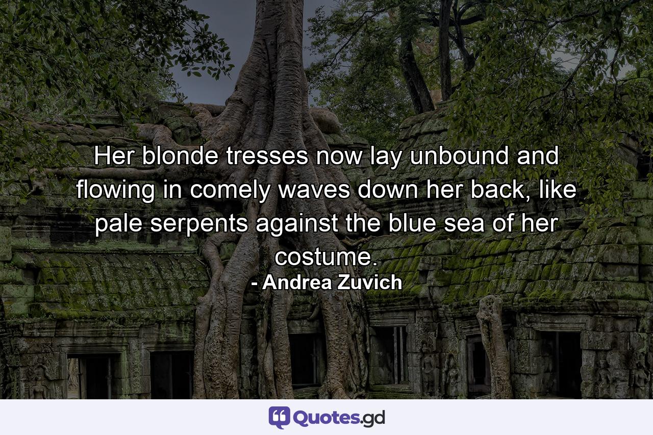 Her blonde tresses now lay unbound and flowing in comely waves down her back, like pale serpents against the blue sea of her costume.