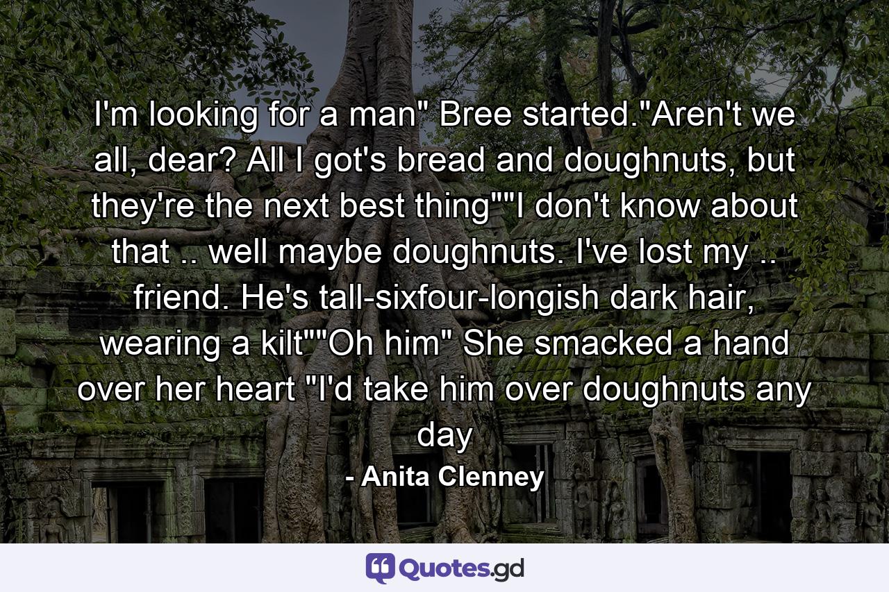 I’m looking for a man” Bree started.”Aren’t we all, dear? All I got’s bread and doughnuts, but they’re the next best thing””I don’t know about that .. well maybe doughnuts. I’ve lost my .. friend. He’s tall-sixfour-longish dark hair, wearing a kilt””Oh him” She smacked a hand over her heart “I’d take him over doughnuts any day
