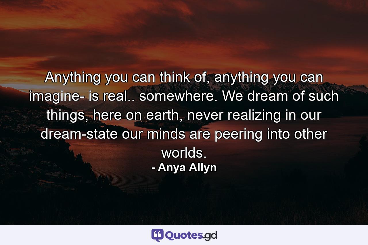 Anything you can think of, anything you can imagine- is real.. somewhere. We dream of such things, here on earth, never realizing in our dream-state our minds are peering into other worlds.