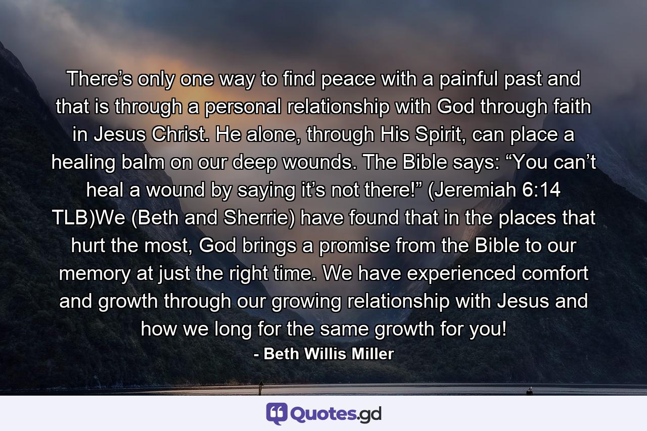 There’s only one way to find peace with a painful past and that is through a personal relationship with God through faith in Jesus Christ. He alone, through His Spirit, can place a healing balm on our deep wounds. The Bible says: “You can’t heal a wound by saying it’s not there!” (Jeremiah 6:14 TLB)We (Beth and Sherrie) have found that in the places that hurt the most, God brings a promise from the Bible to our memory at just the right time. We have experienced comfort and growth through our growing relationship with Jesus and how we long for the same growth for you!