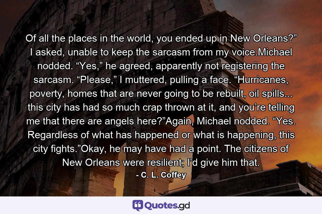 Of all the places in the world, you ended up in New Orleans?” I asked, unable to keep the sarcasm from my voice.Michael nodded. “Yes,” he agreed, apparently not registering the sarcasm. “Please,” I muttered, pulling a face. “Hurricanes, poverty, homes that are never going to be rebuilt, oil spills… this city has had so much crap thrown at it, and you’re telling me that there are angels here?”Again, Michael nodded. “Yes. Regardless of what has happened or what is happening, this city fights.”Okay, he may have had a point. The citizens of New Orleans were resilient; I’d give him that.