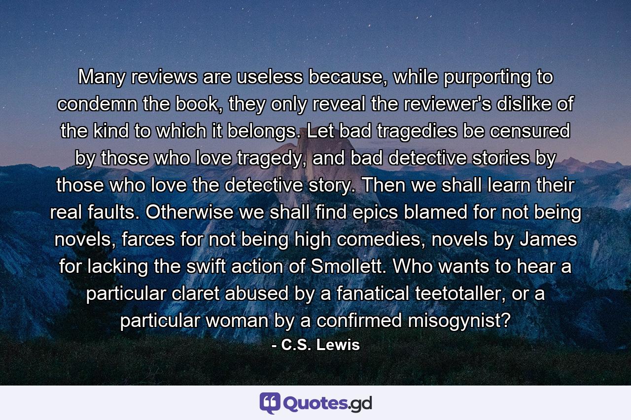 Many reviews are useless because, while purporting to condemn the book, they only reveal the reviewer’s dislike of the kind to which it belongs. Let bad tragedies be censured by those who love tragedy, and bad detective stories by those who love the detective story. Then we shall learn their real faults. Otherwise we shall find epics blamed for not being novels, farces for not being high comedies, novels by James for lacking the swift action of Smollett. Who wants to hear a particular claret abused by a fanatical teetotaller, or a particular woman by a confirmed misogynist?