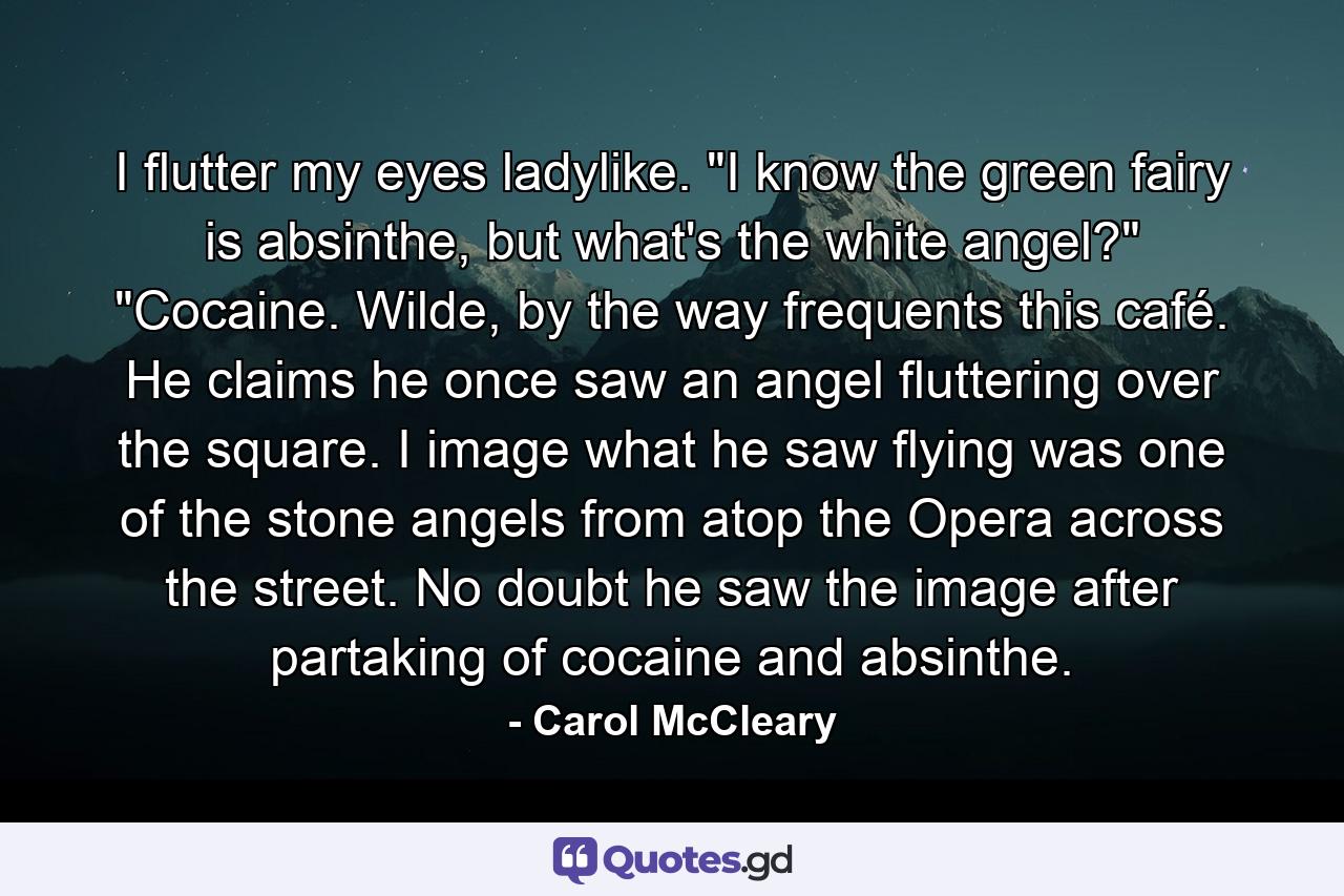 I flutter my eyes ladylike. “I know the green fairy is absinthe, but what’s the white angel?” “Cocaine. Wilde, by the way frequents this café. He claims he once saw an angel fluttering over the square. I image what he saw flying was one of the stone angels from atop the Opera across the street. No doubt he saw the image after partaking of cocaine and absinthe.
