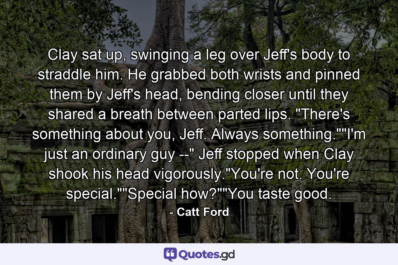 Clay sat up, swinging a leg over Jeff’s body to straddle him. He grabbed both wrists and pinned them by Jeff’s head, bending closer until they shared a breath between parted lips. “There’s something about you, Jeff. Always something.””I’m just an ordinary guy –” Jeff stopped when Clay shook his head vigorously.”You’re not. You’re special.””Special how?””You taste good.