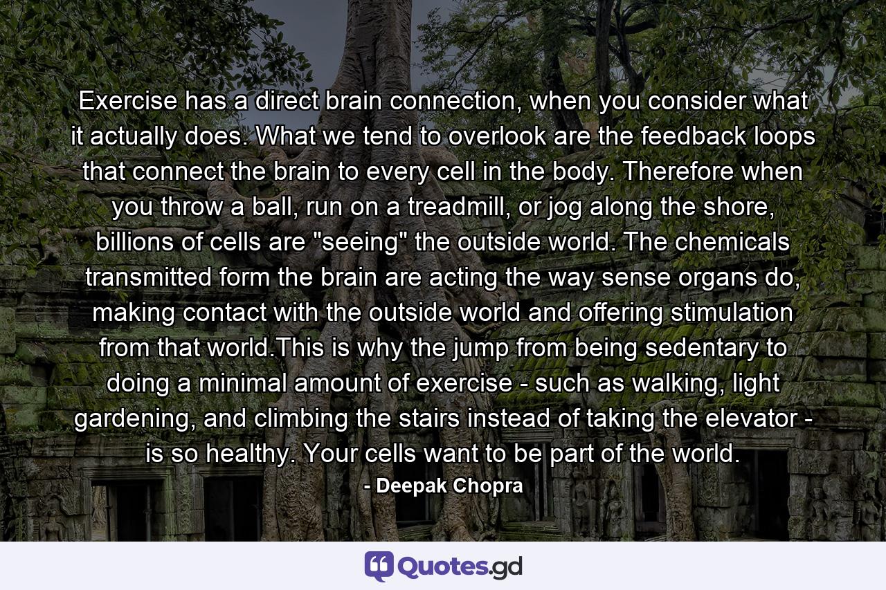 Exercise has a direct brain connection, when you consider what it actually does. What we tend to overlook are the feedback loops that connect the brain to every cell in the body. Therefore when you throw a ball, run on a treadmill, or jog along the shore, billions of cells are “seeing” the outside world. The chemicals transmitted form the brain are acting the way sense organs do, making contact with the outside world and offering stimulation from that world.This is why the jump from being sedentary to doing a minimal amount of exercise – such as walking, light gardening, and climbing the stairs instead of taking the elevator – is so healthy. Your cells want to be part of the world.