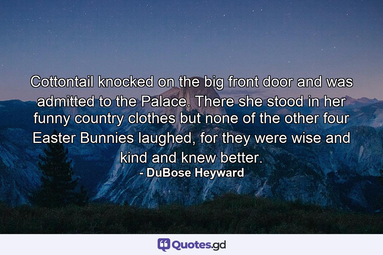 Cottontail knocked on the big front door and was admitted to the Palace. There she stood in her funny country clothes but none of the other four Easter Bunnies laughed, for they were wise and kind and knew better.