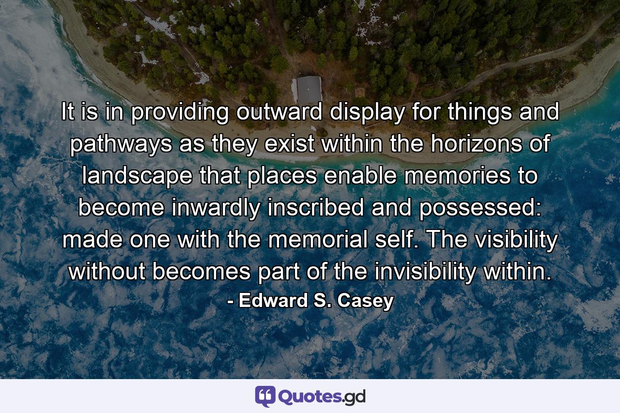 It is in providing outward display for things and pathways as they exist within the horizons of landscape that places enable memories to become inwardly inscribed and possessed: made one with the memorial self. The visibility without becomes part of the invisibility within.