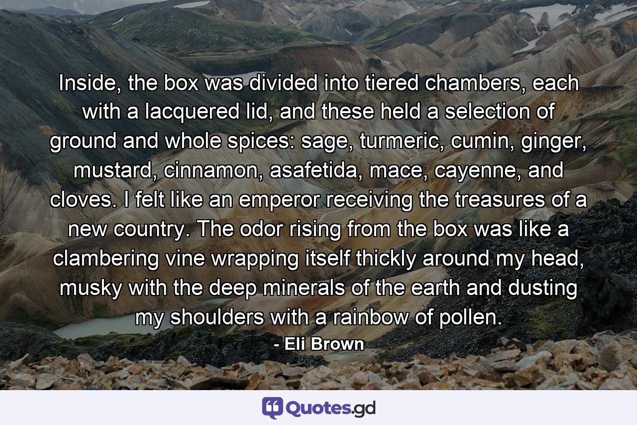 Inside, the box was divided into tiered chambers, each with a lacquered lid, and these held a selection of ground and whole spices: sage, turmeric, cumin, ginger, mustard, cinnamon, asafetida, mace, cayenne, and cloves. I felt like an emperor receiving the treasures of a new country. The odor rising from the box was like a clambering vine wrapping itself thickly around my head, musky with the deep minerals of the earth and dusting my shoulders with a rainbow of pollen.