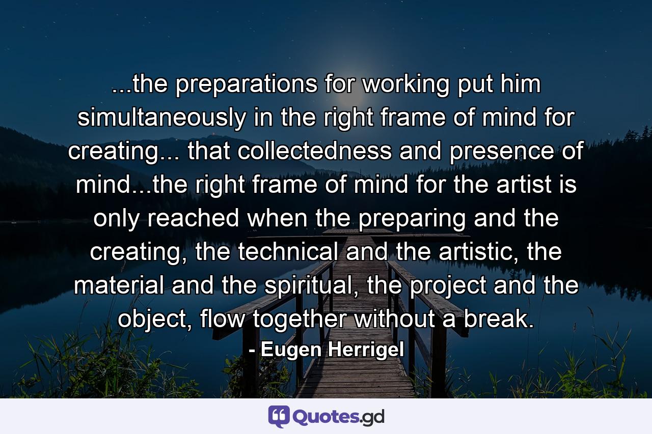 …the preparations for working put him simultaneously in the right frame of mind for creating… that collectedness and presence of mind…the right frame of mind for the artist is only reached when the preparing and the creating, the technical and the artistic, the material and the spiritual, the project and the object, flow together without a break.