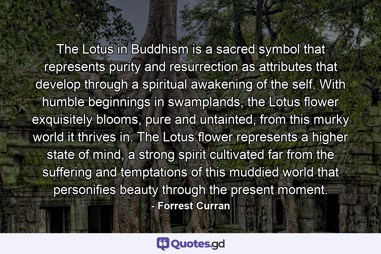 The Lotus in Buddhism is a sacred symbol that represents purity and resurrection as attributes that develop through a spiritual awakening of the self. With humble beginnings in swamplands, the Lotus flower exquisitely blooms, pure and untainted, from this murky world it thrives in. The Lotus flower represents a higher state of mind, a strong spirit cultivated far from the suffering and temptations of this muddied world that personifies beauty through the present moment.