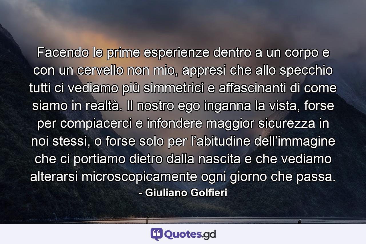 Facendo le prime esperienze dentro a un corpo e con un cervello non mio, appresi che allo specchio tutti ci vediamo più simmetrici e affascinanti di come siamo in realtà. Il nostro ego inganna la vista, forse per compiacerci e infondere maggior sicurezza in noi stessi, o forse solo per l’abitudine dell’immagine che ci portiamo dietro dalla nascita e che vediamo alterarsi microscopicamente ogni giorno che passa.