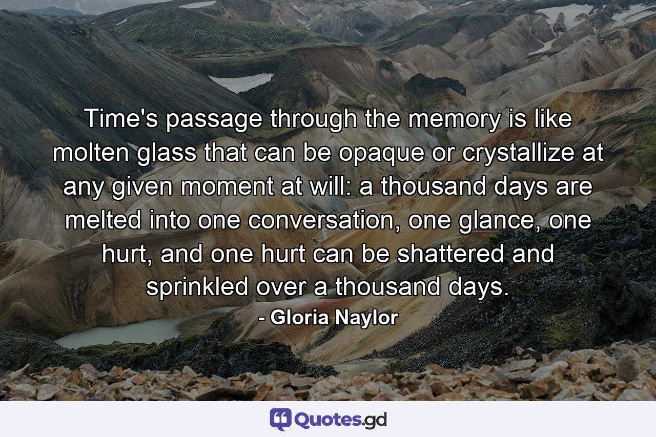 Time’s passage through the memory is like molten glass that can be opaque or crystallize at any given moment at will: a thousand days are melted into one conversation, one glance, one hurt, and one hurt can be shattered and sprinkled over a thousand days.