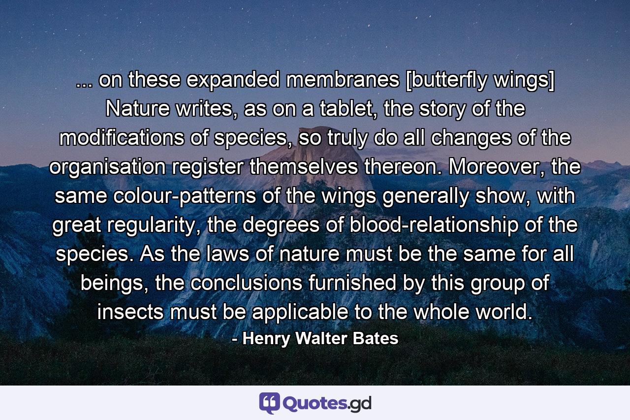 … on these expanded membranes [butterfly wings] Nature writes, as on a tablet, the story of the modifications of species, so truly do all changes of the organisation register themselves thereon. Moreover, the same colour-patterns of the wings generally show, with great regularity, the degrees of blood-relationship of the species. As the laws of nature must be the same for all beings, the conclusions furnished by this group of insects must be applicable to the whole world.