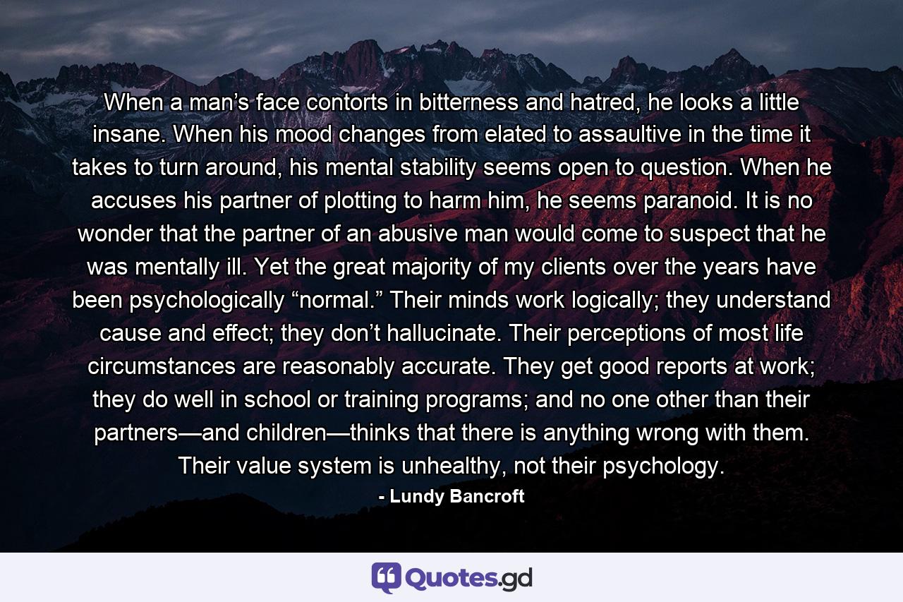 When a man’s face contorts in bitterness and hatred, he looks a little insane. When his mood changes from elated to assaultive in the time it takes to turn around, his mental stability seems open to question. When he accuses his partner of plotting to harm him, he seems paranoid. It is no wonder that the partner of an abusive man would come to suspect that he was mentally ill. Yet the great majority of my clients over the years have been psychologically “normal.” Their minds work logically; they understand cause and effect; they don’t hallucinate. Their perceptions of most life circumstances are reasonably accurate. They get good reports at work; they do well in school or training programs; and no one other than their partners—and children—thinks that there is anything wrong with them. Their value system is unhealthy, not their psychology.