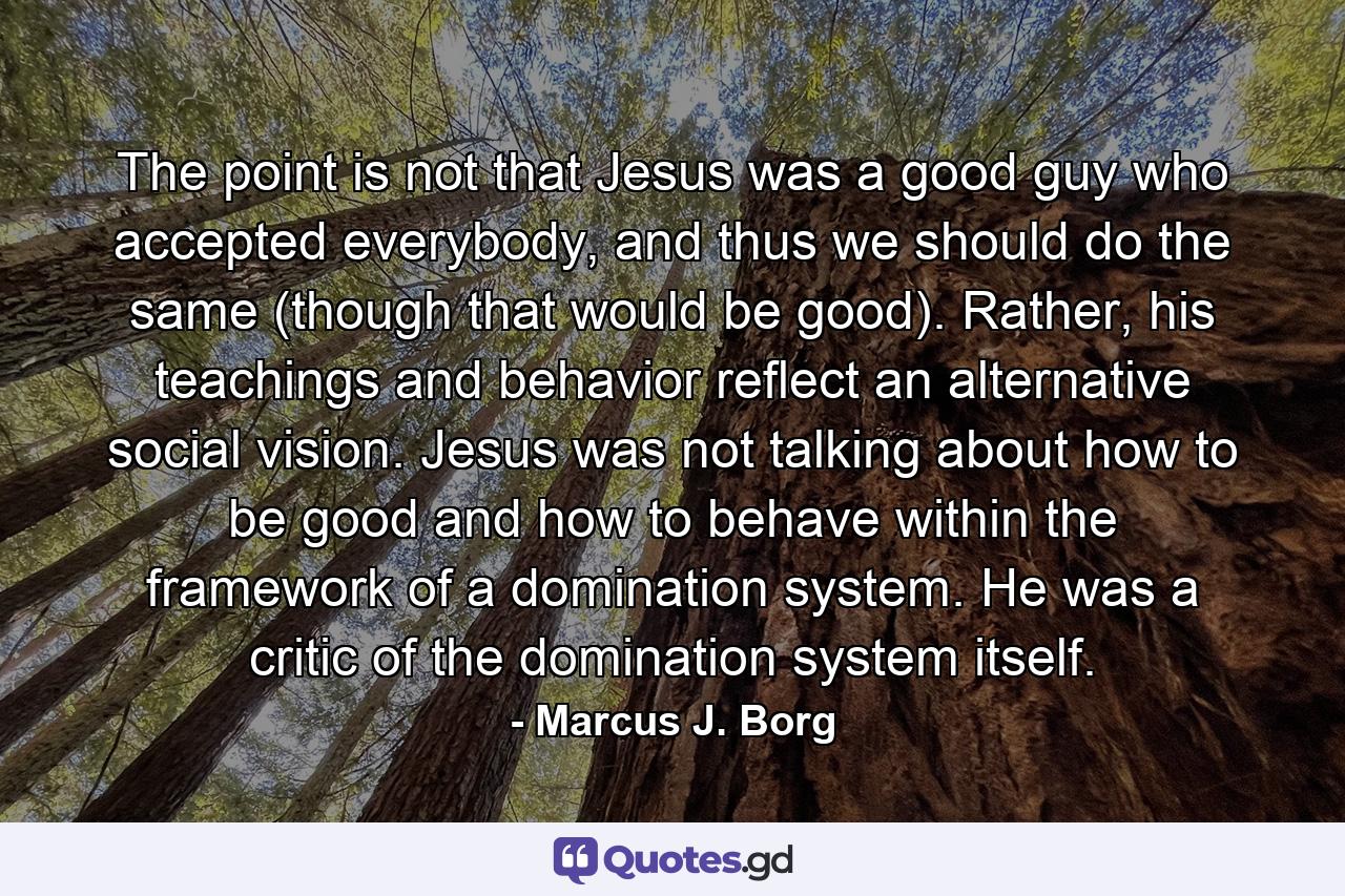 The point is not that Jesus was a good guy who accepted everybody, and thus we should do the same (though that would be good). Rather, his teachings and behavior reflect an alternative social vision. Jesus was not talking about how to be good and how to behave within the framework of a domination system. He was a critic of the domination system itself.