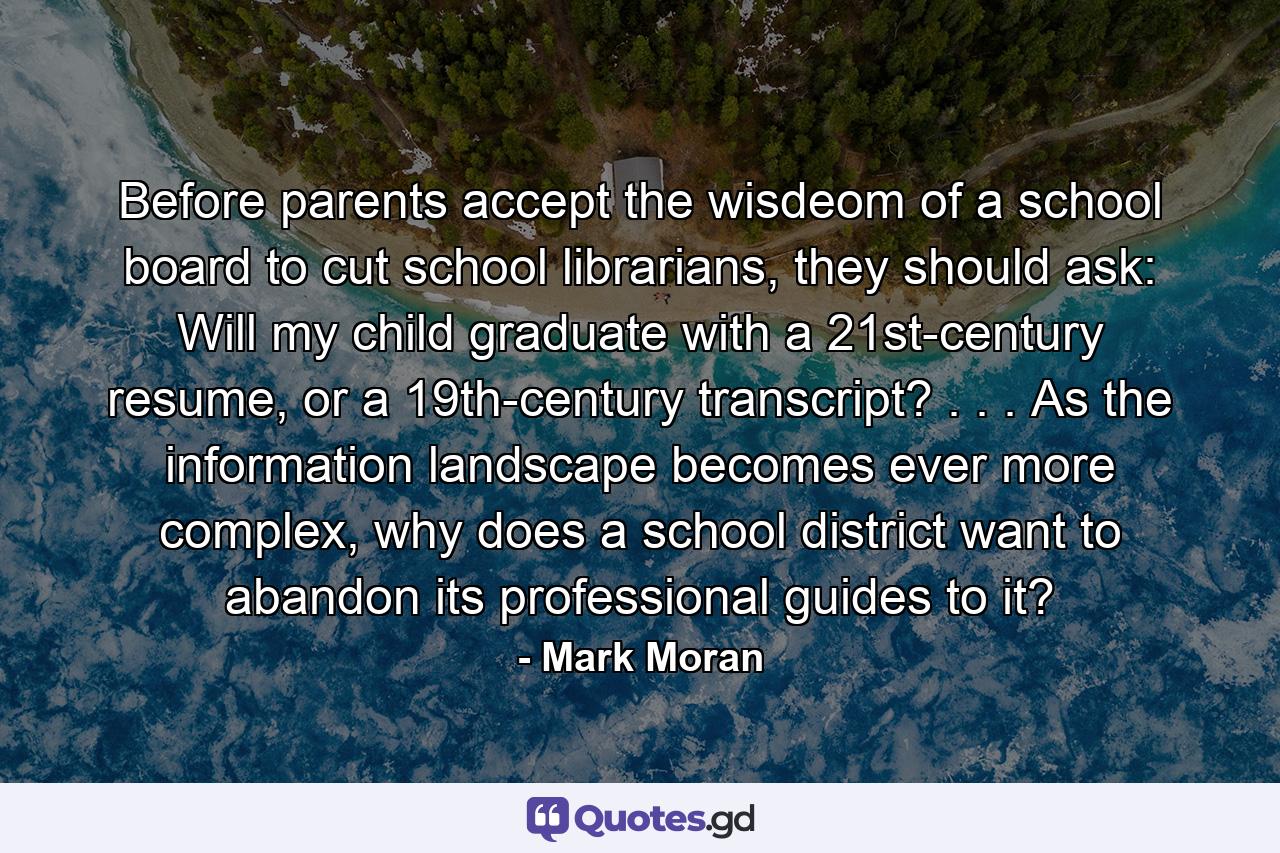 Before parents accept the wisdeom of a school board to cut school librarians, they should ask: Will my child graduate with a 21st-century resume, or a 19th-century transcript? . . . As the information landscape becomes ever more complex, why does a school district want to abandon its professional guides to it?