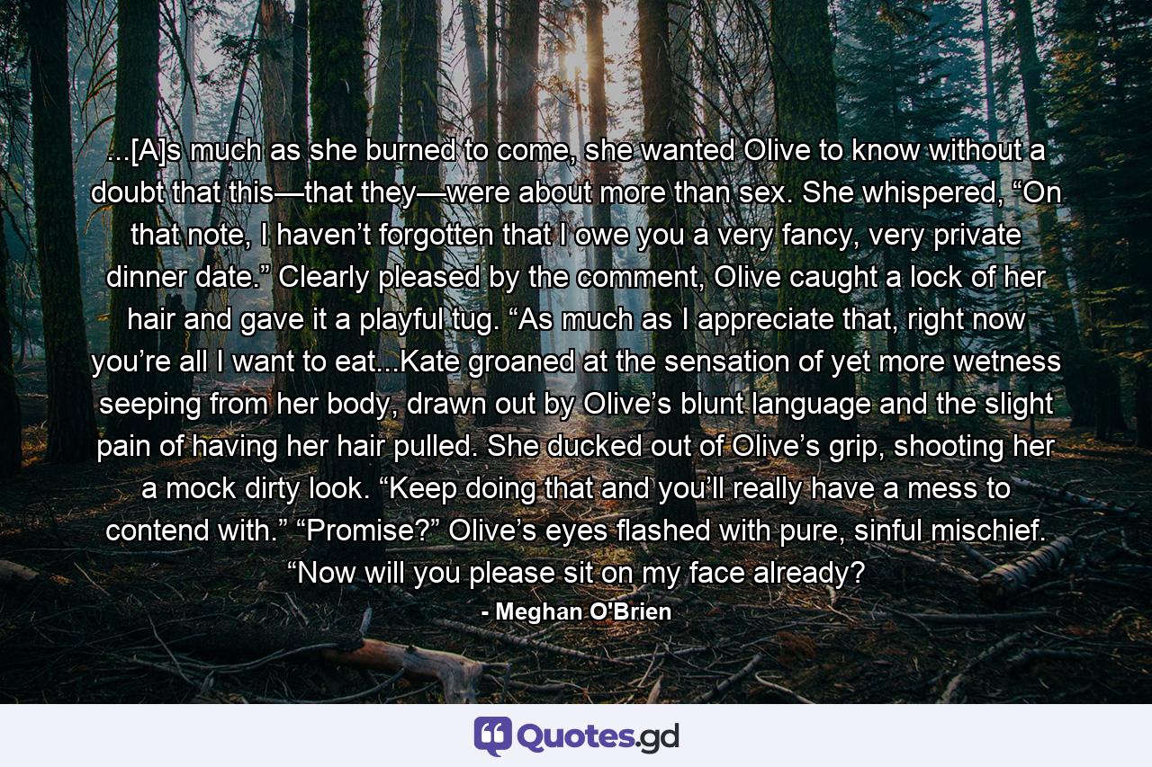 …[A]s much as she burned to come, she wanted Olive to know without a doubt that this—that they—were about more than sex. She whispered, “On that note, I haven’t forgotten that I owe you a very fancy, very private dinner date.” Clearly pleased by the comment, Olive caught a lock of her hair and gave it a playful tug. “As much as I appreciate that, right now you’re all I want to eat…Kate groaned at the sensation of yet more wetness seeping from her body, drawn out by Olive’s blunt language and the slight pain of having her hair pulled. She ducked out of Olive’s grip, shooting her a mock dirty look. “Keep doing that and you’ll really have a mess to contend with.” “Promise?” Olive’s eyes flashed with pure, sinful mischief. “Now will you please sit on my face already?
