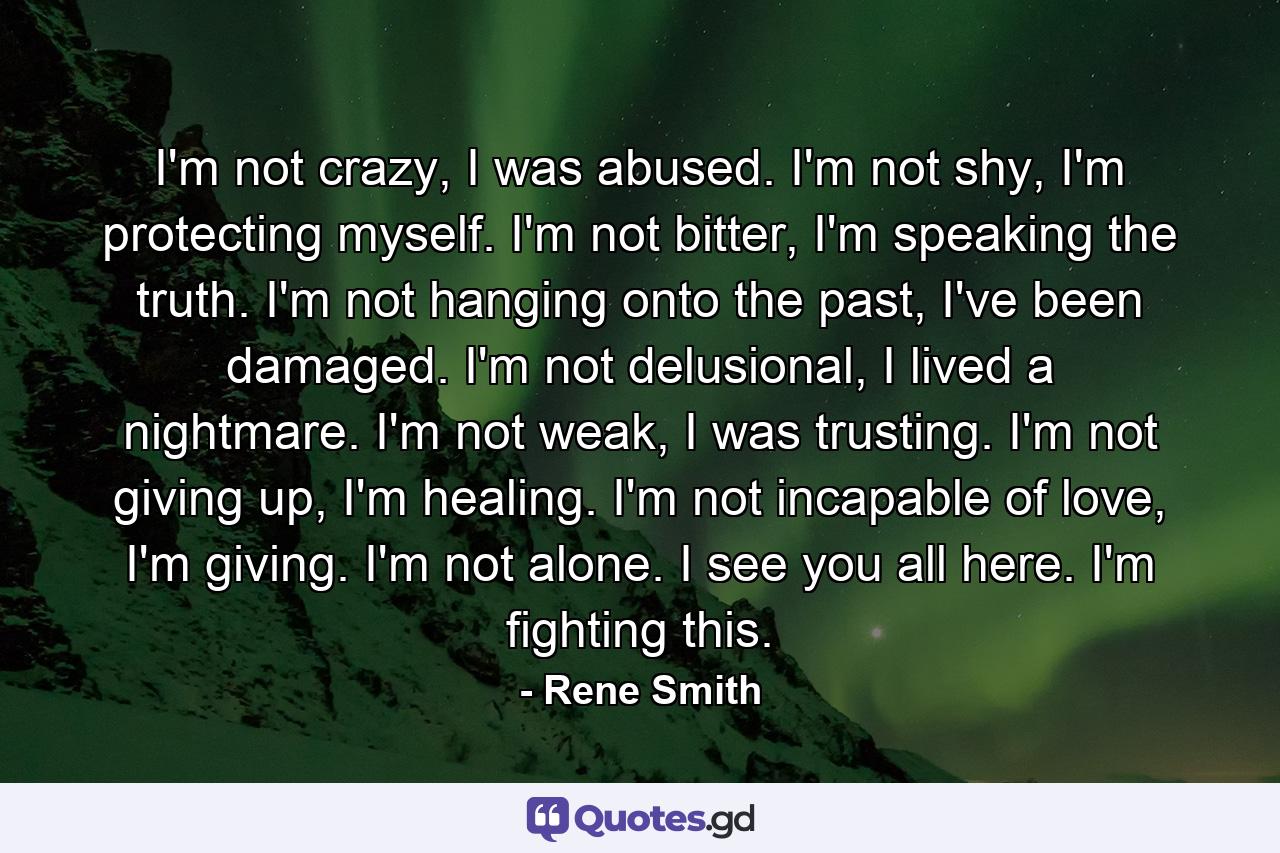 I’m not crazy, I was abused. I’m not shy, I’m protecting myself. I’m not bitter, I’m speaking the truth. I’m not hanging onto the past, I’ve been damaged. I’m not delusional, I lived a nightmare. I’m not weak, I was trusting. I’m not giving up, I’m healing. I’m not incapable of love, I’m giving. I’m not alone. I see you all here. I’m fighting this.