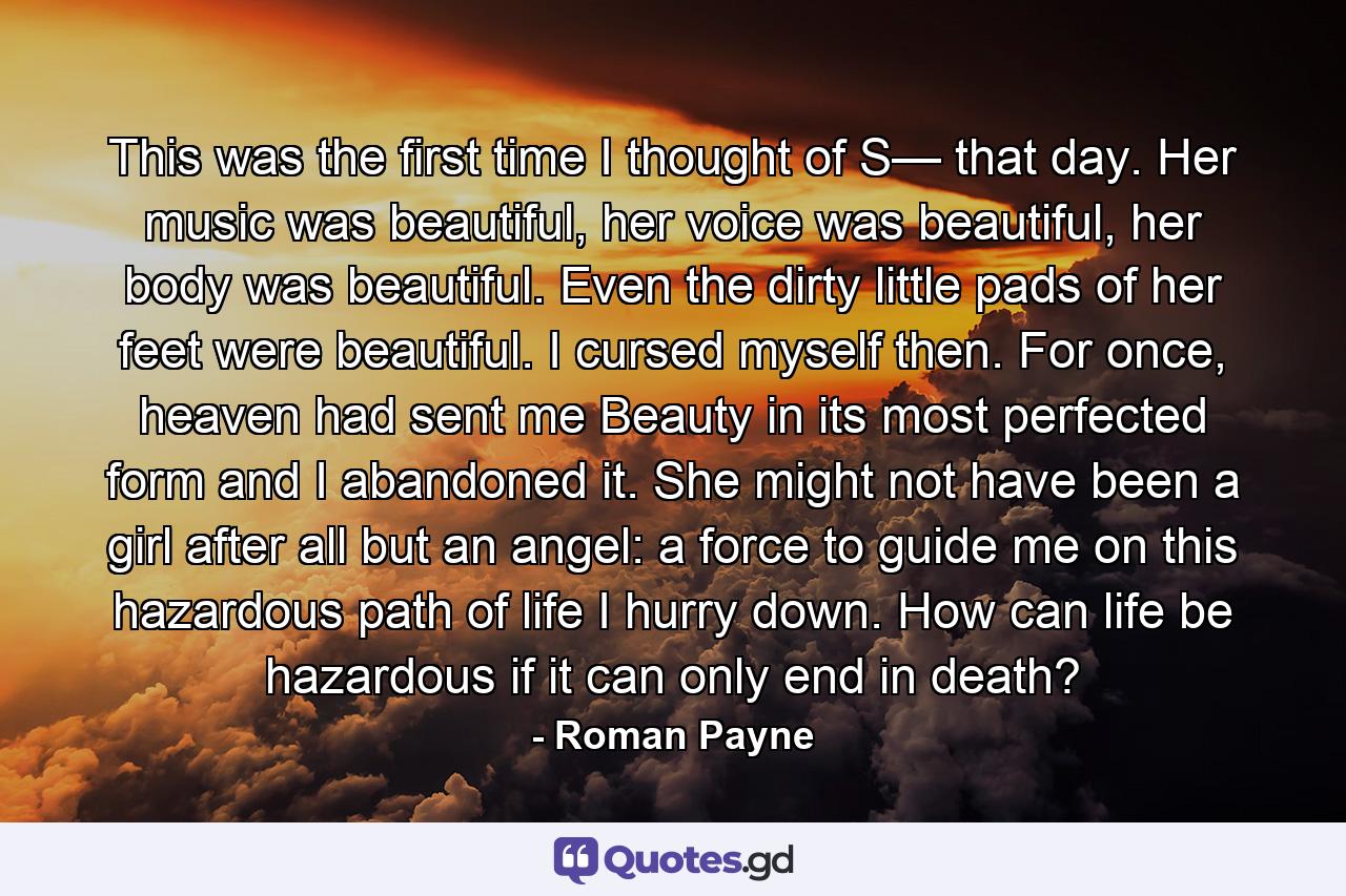 This was the first time I thought of S— that day. Her music was beautiful, her voice was beautiful, her body was beautiful. Even the dirty little pads of her feet were beautiful. I cursed myself then. For once, heaven had sent me Beauty in its most perfected form and I abandoned it. She might not have been a girl after all but an angel: a force to guide me on this hazardous path of life I hurry down. How can life be hazardous if it can only end in death?