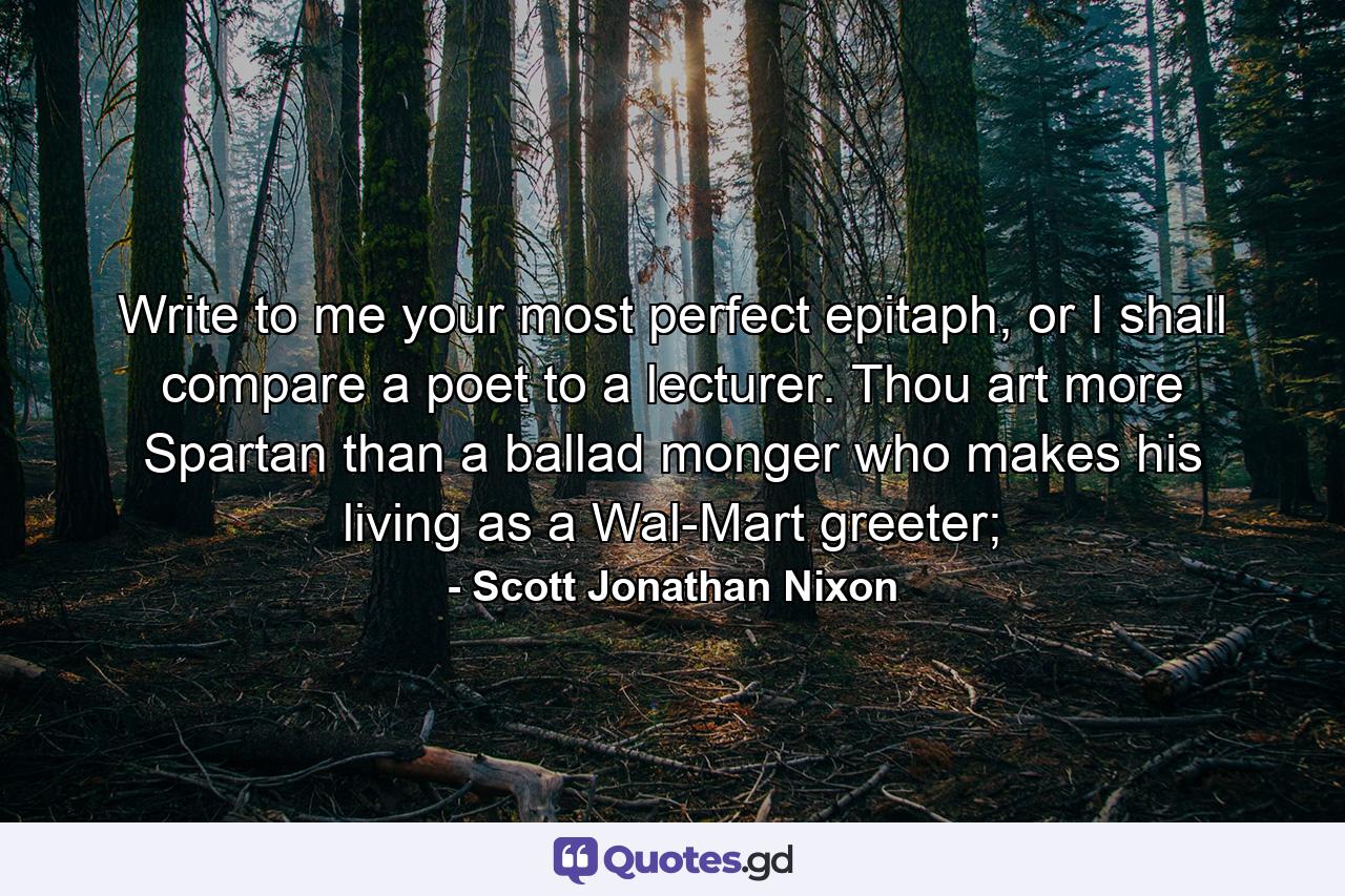 Write to me your most perfect epitaph, or I shall compare a poet to a lecturer. Thou art more Spartan than a ballad monger who makes his living as a Wal-Mart greeter;