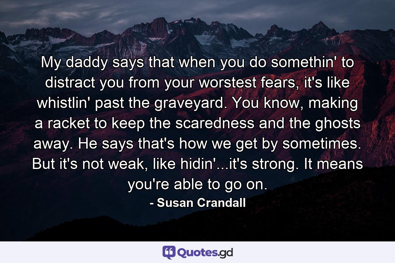 My daddy says that when you do somethin’ to distract you from your worstest fears, it’s like whistlin’ past the graveyard. You know, making a racket to keep the scaredness and the ghosts away. He says that’s how we get by sometimes. But it’s not weak, like hidin’…it’s strong. It means you’re able to go on.