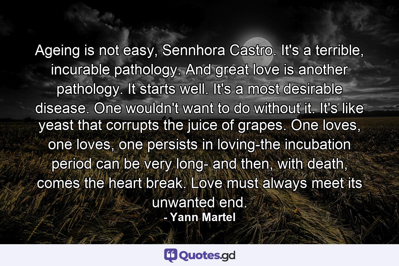 Ageing is not easy, Sennhora Castro. It’s a terrible, incurable pathology. And great love is another pathology. It starts well. It’s a most desirable disease. One wouldn’t want to do without it. It’s like yeast that corrupts the juice of grapes. One loves, one loves, one persists in loving-the incubation period can be very long- and then, with death, comes the heart break. Love must always meet its unwanted end.